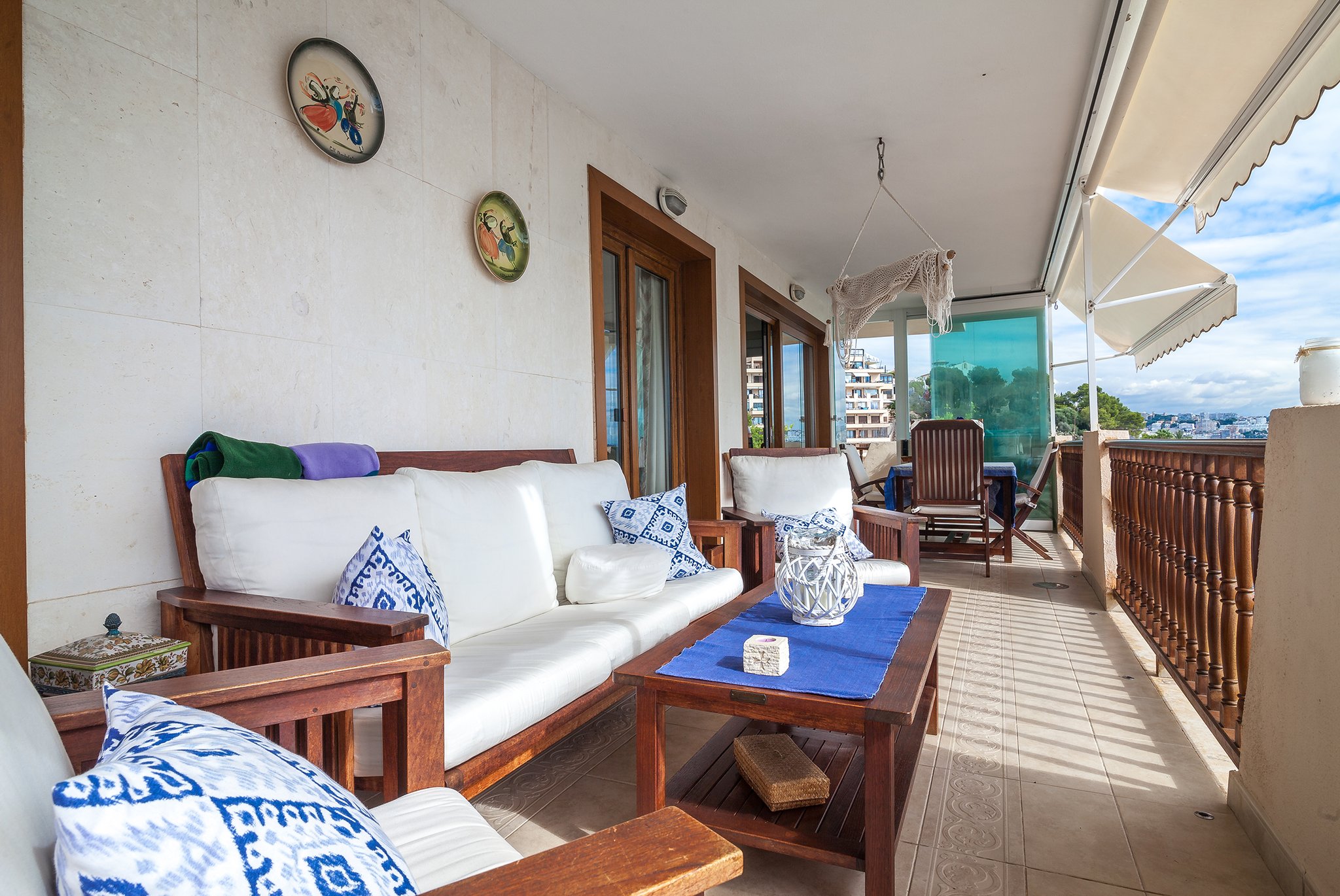 El apartamento tiene 4 dormitorios con armarios empotrados y 3 baños. El dormitorio principal tiene baño en suite y acceso directo a la terraza principal. La sala de estar / comedor es luminosa y tiene un tamaño generoso. Aquí encontrará una chimenea y acceso directo a dos terrazas frente al mar con vistas diferentes. La terraza principal ha sido equipado con paneles de vidrio que se pueden cerrar para crear un acogedor ambiente interior / exterior en los días más fríos. Esta terraza tiene una parrilla incorporada así como una chimenea. La cocina es moderna y está bien equipada, y se conecta a la terraza lateral. El área de la piscina comunitaria está bien cuidada y tiene una vista maravillosa y un área de almacenamiento. La propiedad tiene acceso directo al mar a través de unas escaleras de acero inoxidable desde las rocas, y también hay acceso directo a la popular playa y restaurante Balneario Illetas, a través de un caminito desde la parte posterior del edificio.