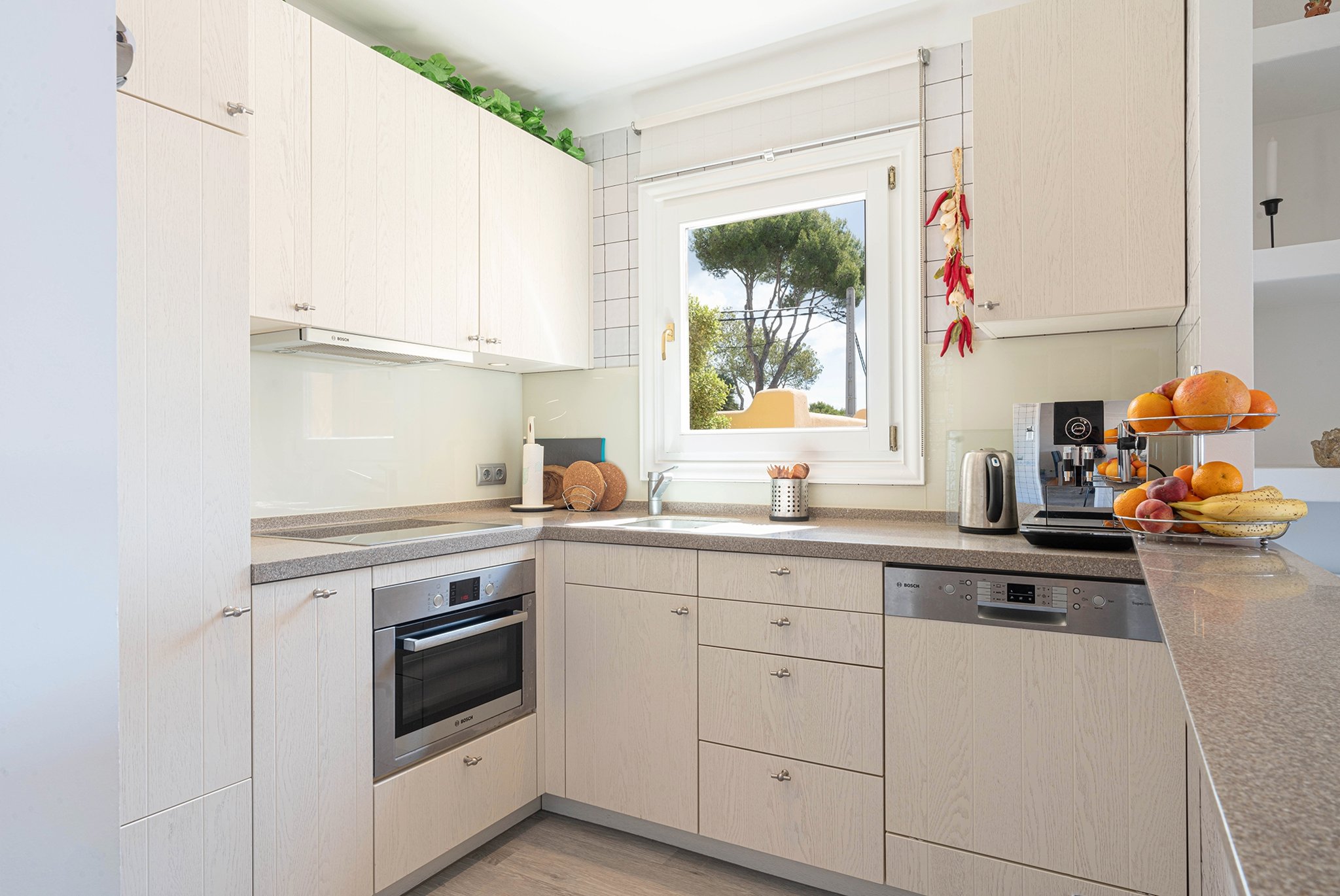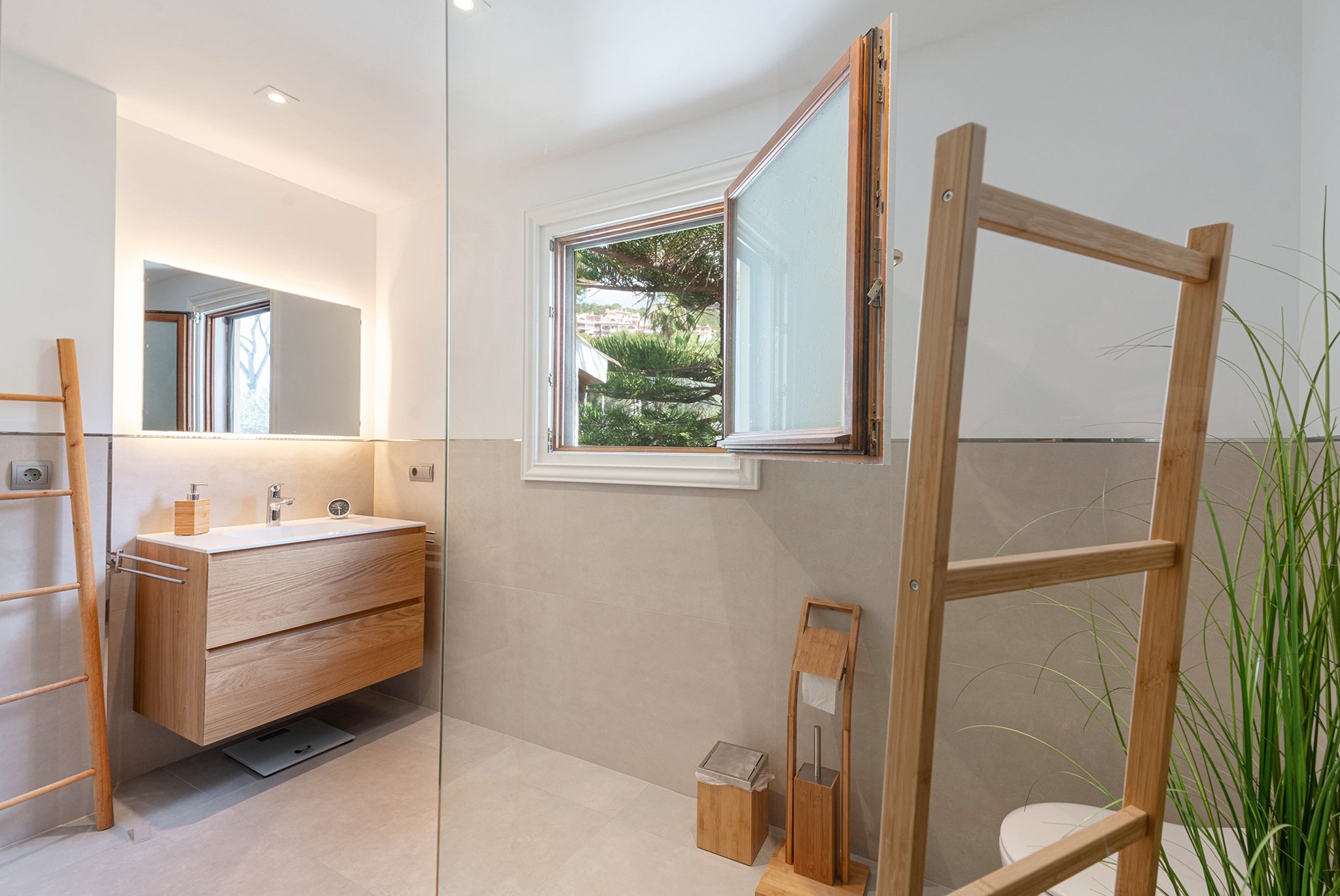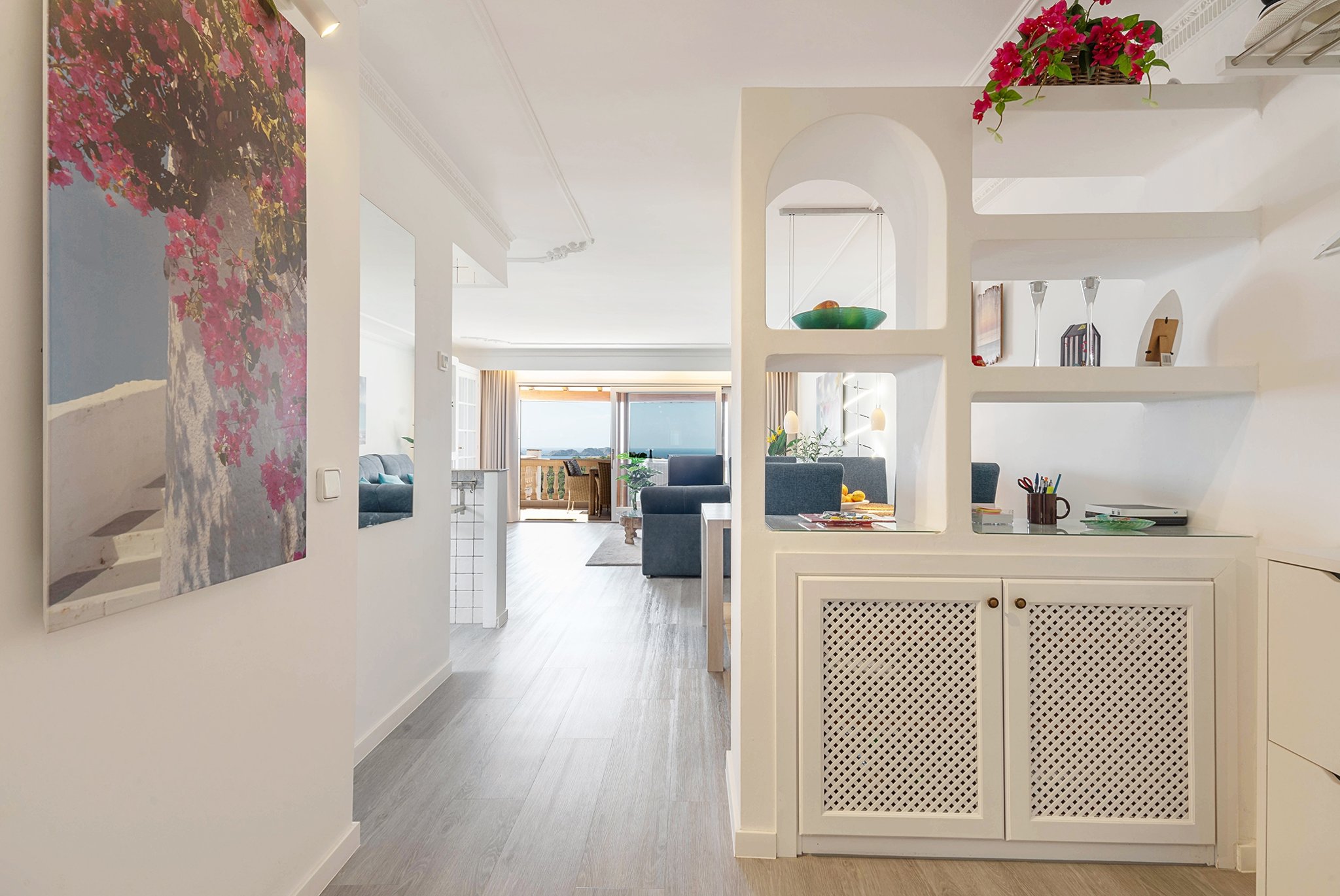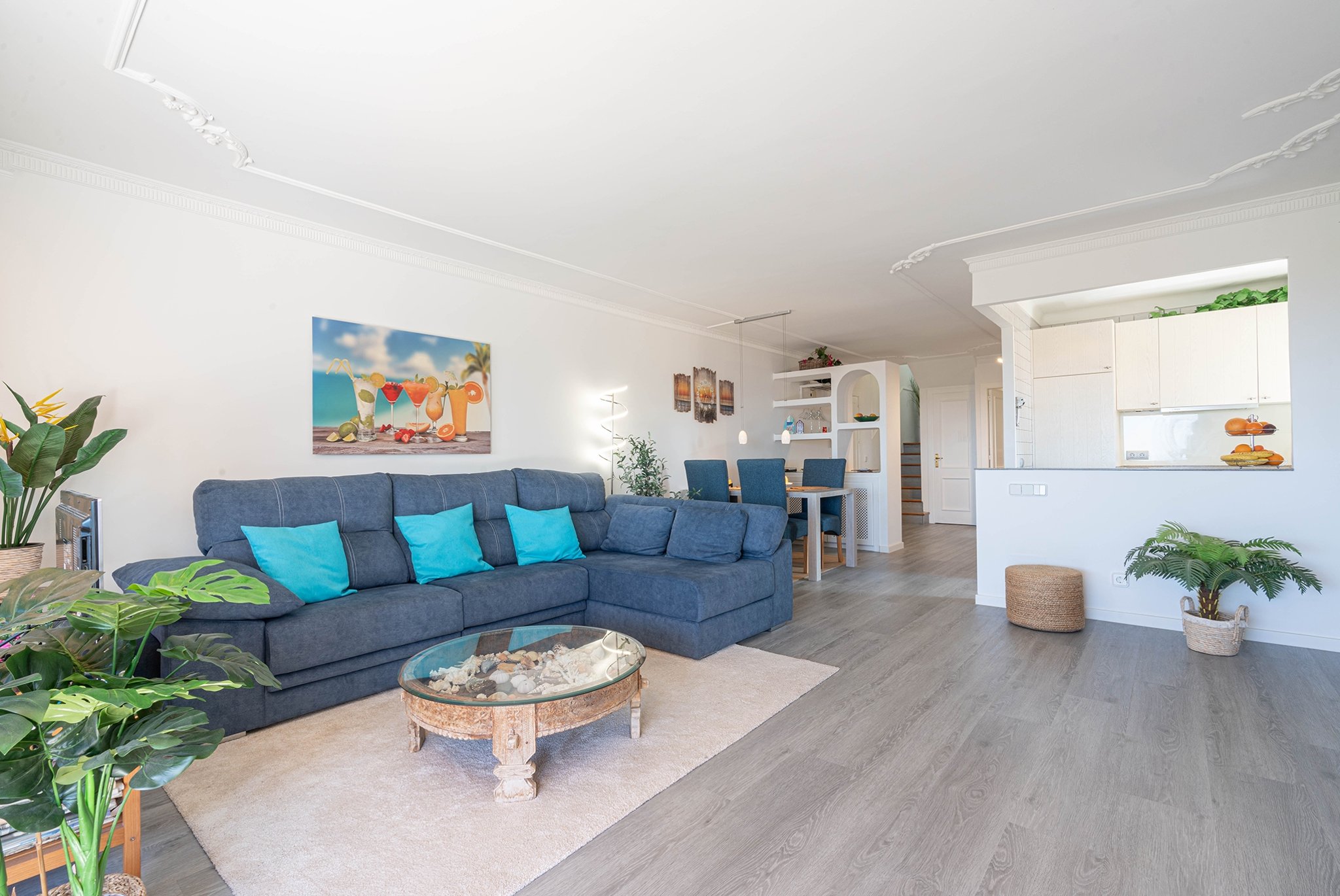 El apartamento tiene una superficie habitable de 115 m2 más terrazas. Se distribuye en dos plantas. En la planta principal encontramos un amplio salón-comedor, una moderna cocina americana totalmente equipada, un dormitorio, un baño y coladuria. La terraza de este nivel cuenta con una acogedora zona chill-out con barbacoa, perfecta para recibir invitados. La planta superior consta de 2 dormitorios decorados con buen gusto con baños adjuntos, y otra atractiva terraza. En 2022, el ático fue ampliamente modernizado y reformado.