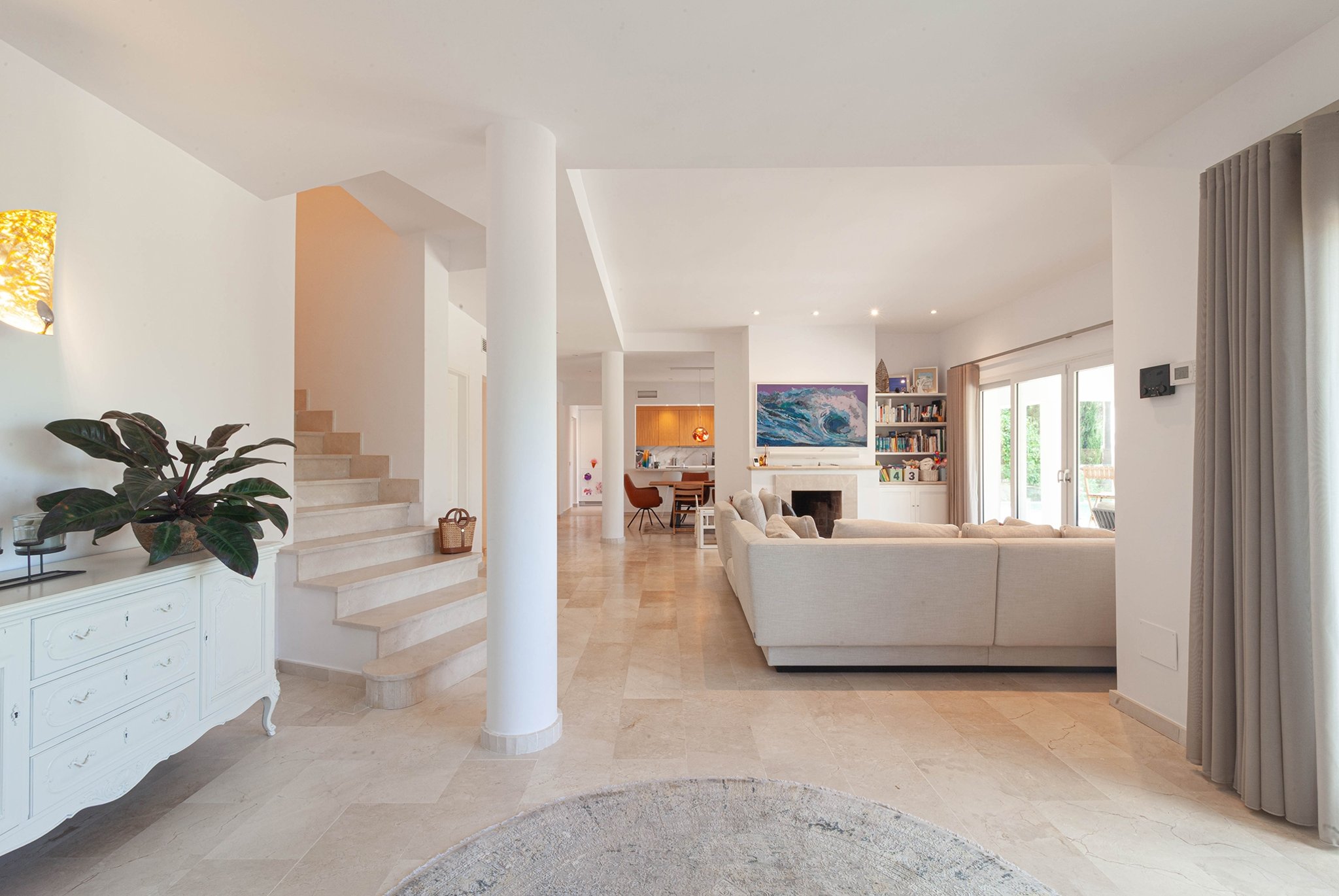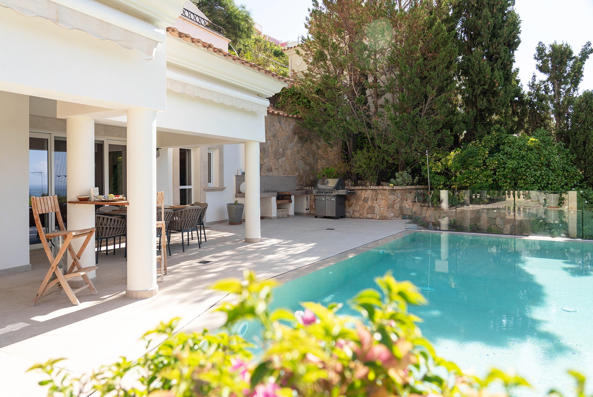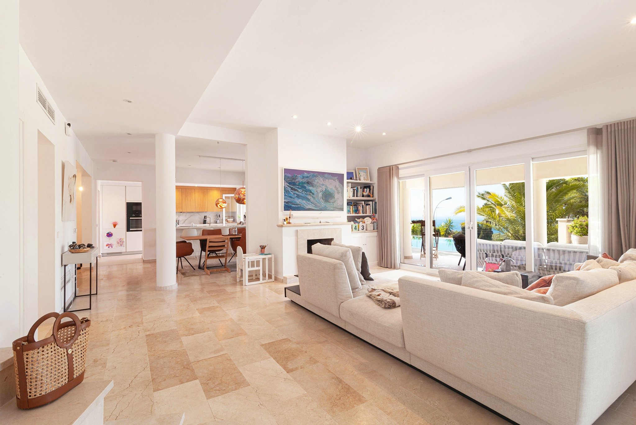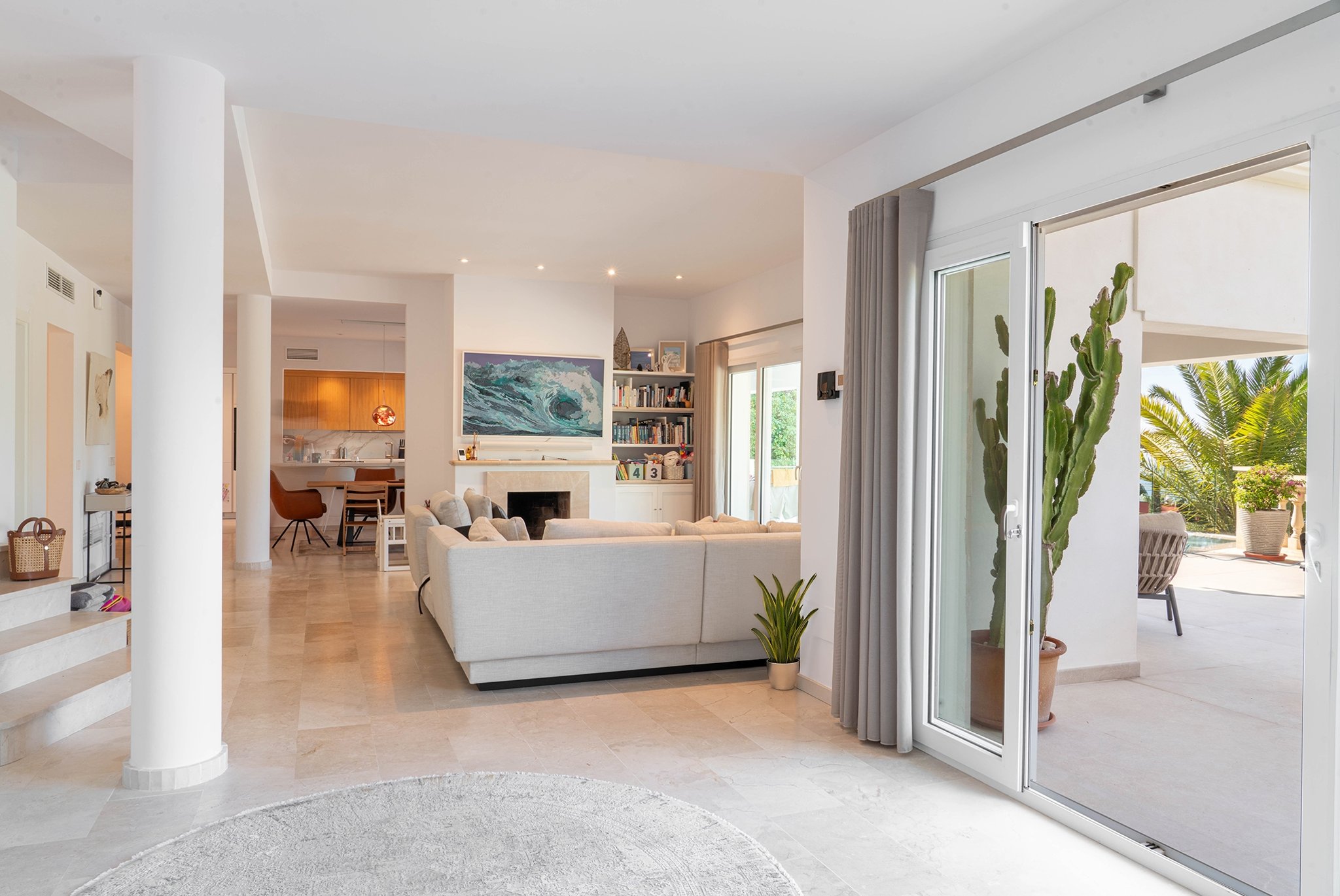La villa fue renovada en 2025 y ofrece 418 m² de superficie habitable sobre una parcela de 754 m². Cuenta con 4 dormitorios y 4 baños, con una distribución bien pensada y espacios abiertos y generosos. El salón es amplio y dispone de chimenea, mientras que la cocina es moderna y totalmente equipada.