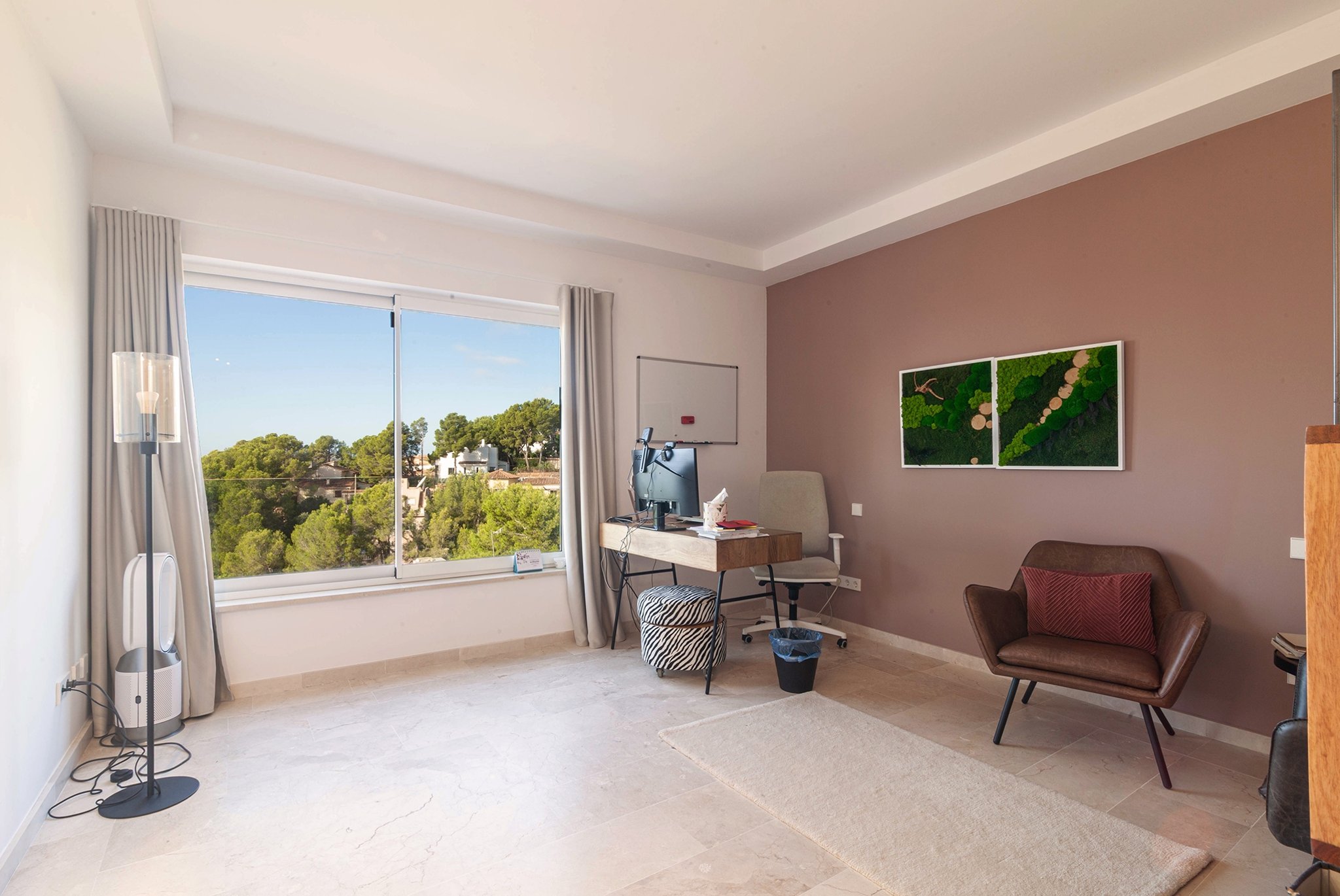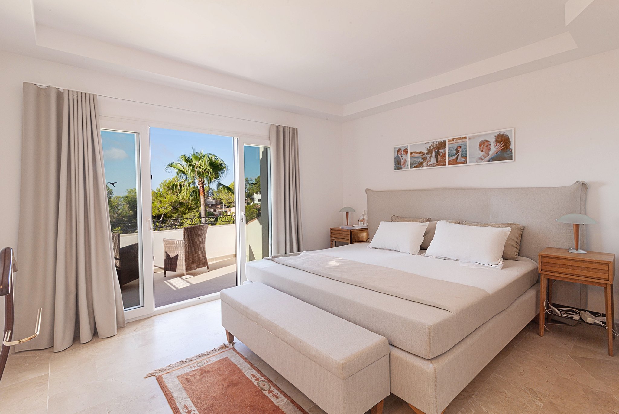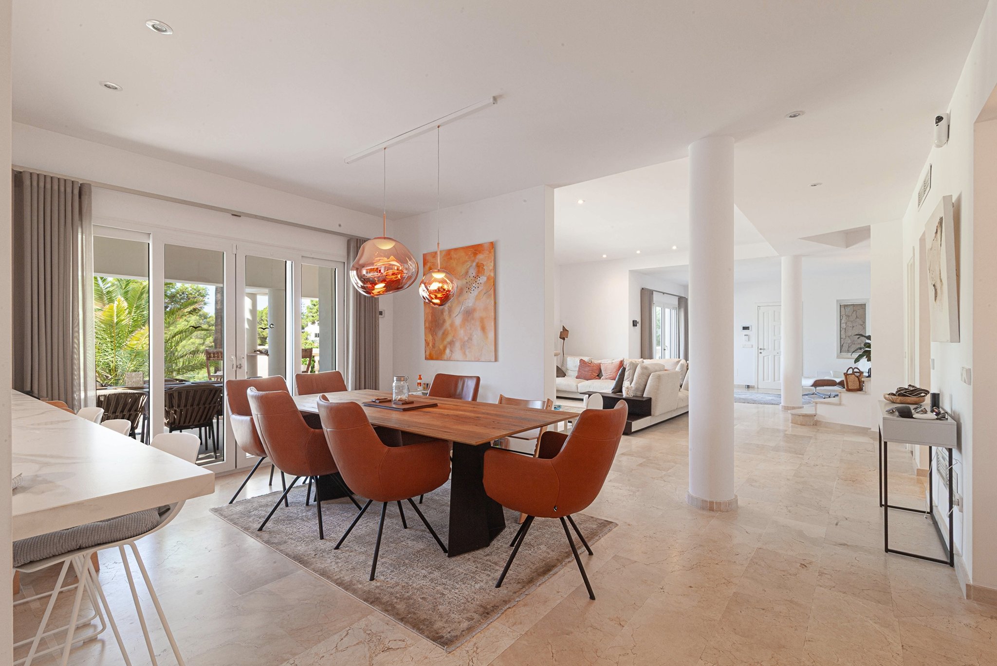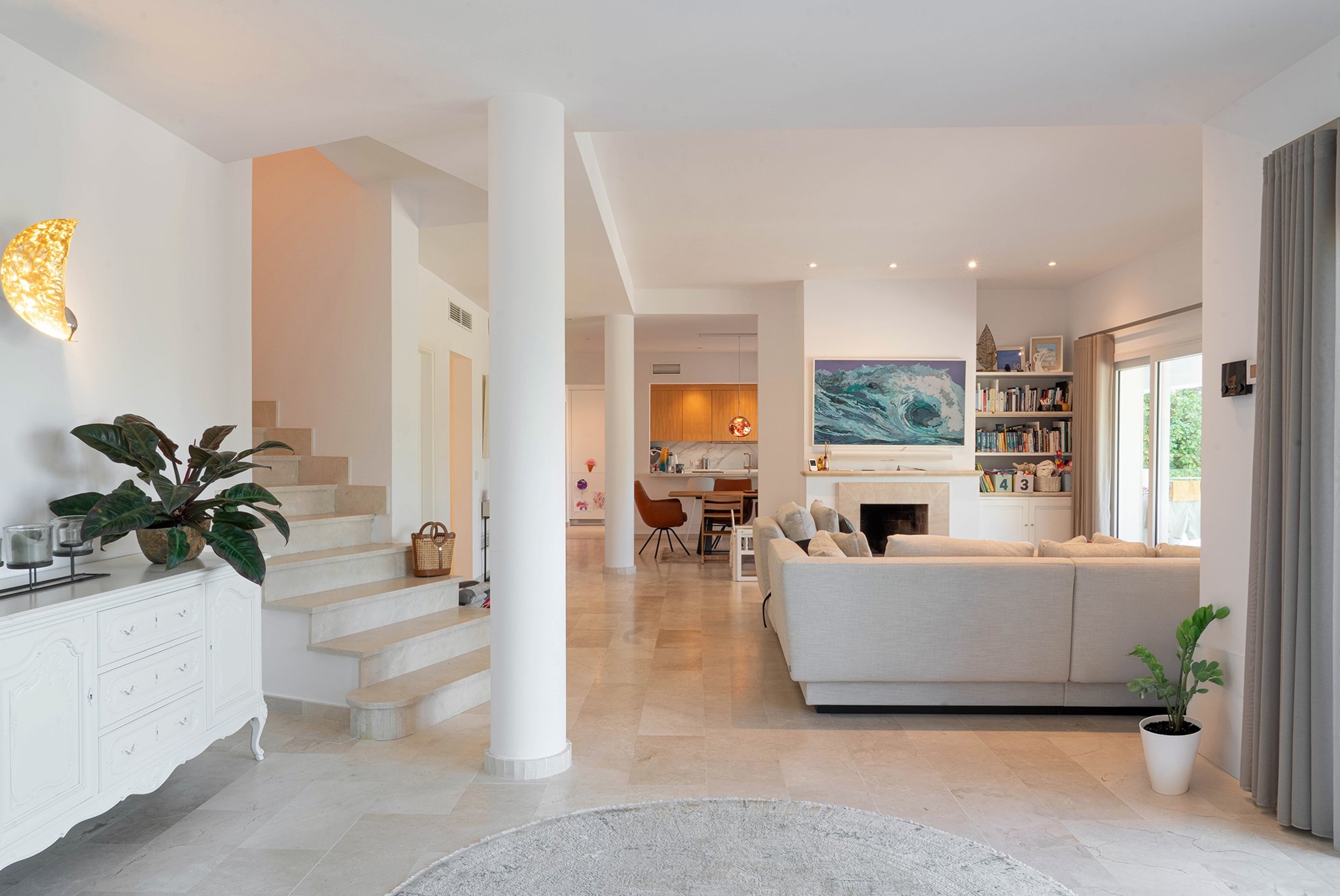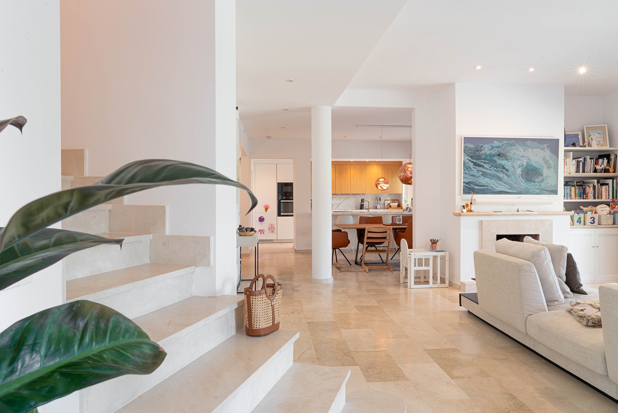 La villa fue renovada en 2025 y ofrece 418 m² de superficie habitable sobre una parcela de 754 m². Cuenta con 4 dormitorios y 4 baños, con una distribución bien pensada y espacios abiertos y generosos. El salón es amplio y dispone de chimenea, mientras que la cocina es moderna y totalmente equipada.