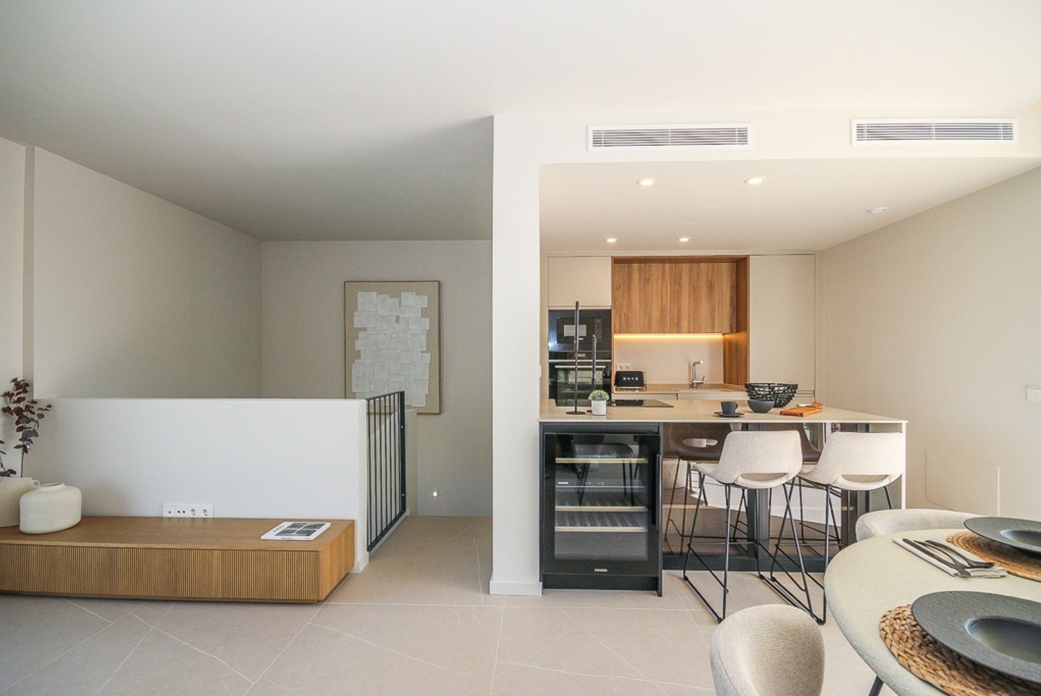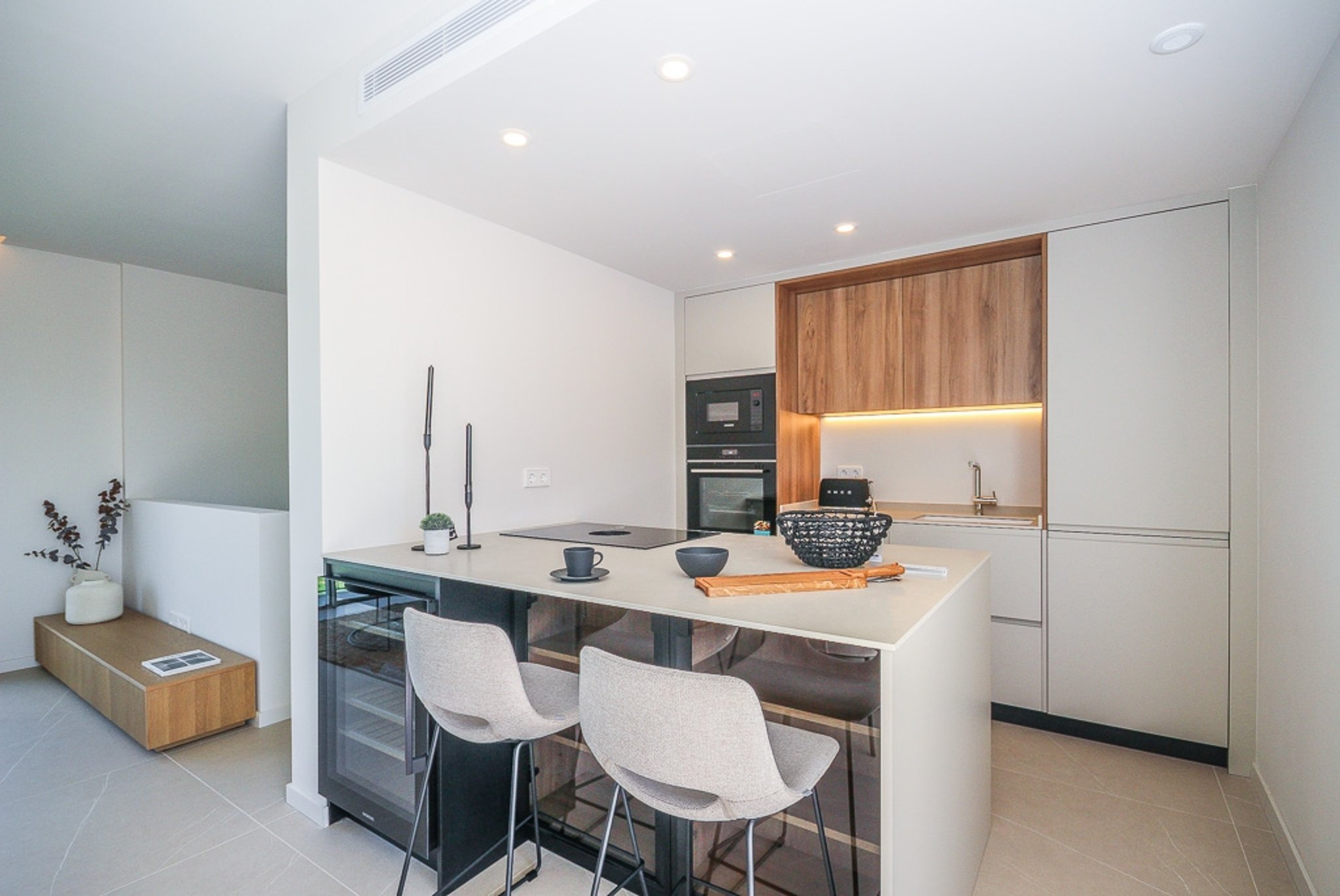 El dúplex cuenta con una superficie de 105 m² más terrazas y consta de dos amplios dormitorios y dos modernos baños, uno de ellos en suite. La cocina está integrada en el salón comedor. En la planta inferior, también hay una habitación adicional que puede utilizarse como dormitorio de invitados, despacho o sala de estar extra.