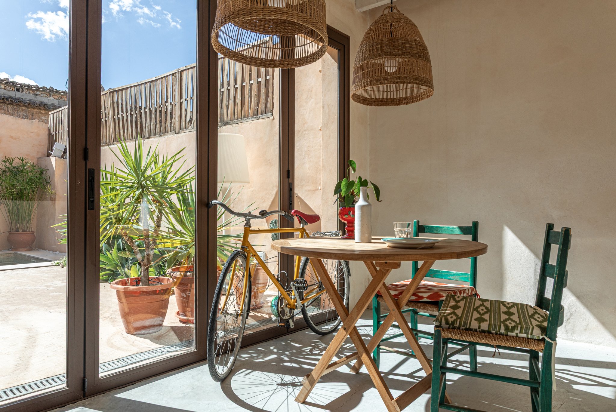 La vivienda fue reformada en 2022 con un estilo boho con mucha luz y encanto, y ofrece un total de 3 dormitorios y 2 baños. La cocina totalmente equipada se abre a tu terraza privada con piscina, perfecta para los días cálidos. En la planta superior encontrarás dos de los tres dormitorios con armarios empotrados, junto con un luminoso salón con chimenea.