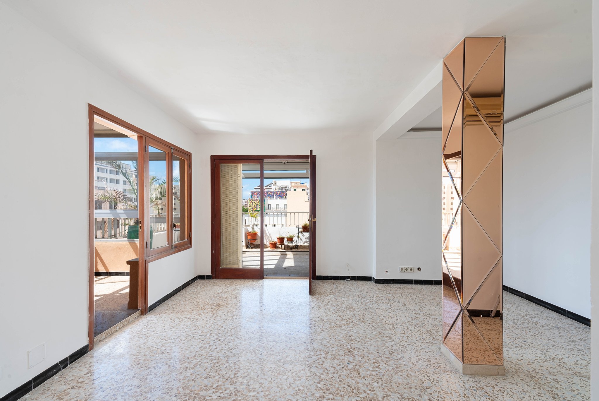 El ático está situado en la 7ª planta de un edificio de 1975. Tiene una superficie habitable de 90 m2 más 30 m2 de terrazas. La superficie habitable consta de un amplio salón, una cocina, tres dormitorios y 2 baños. Dos de los dormitorios son dobles y el tercero es individual. Todos los dormitorios están equipados con armarios empotrados. Existe la posibilidad de abrir entre el salón y la cocina.
