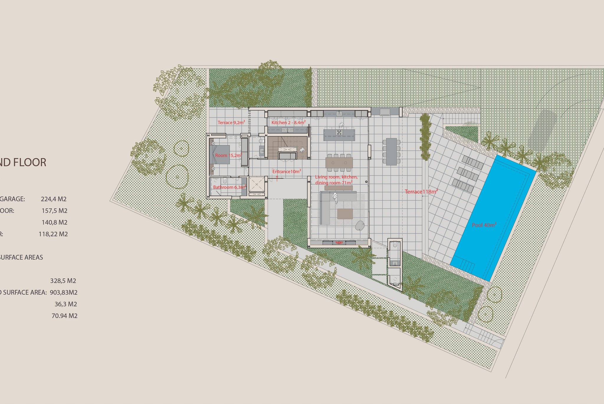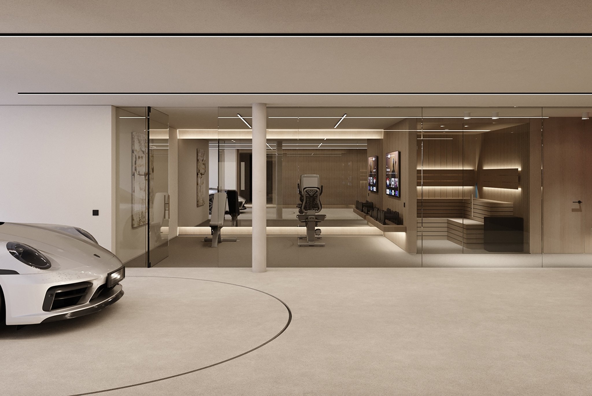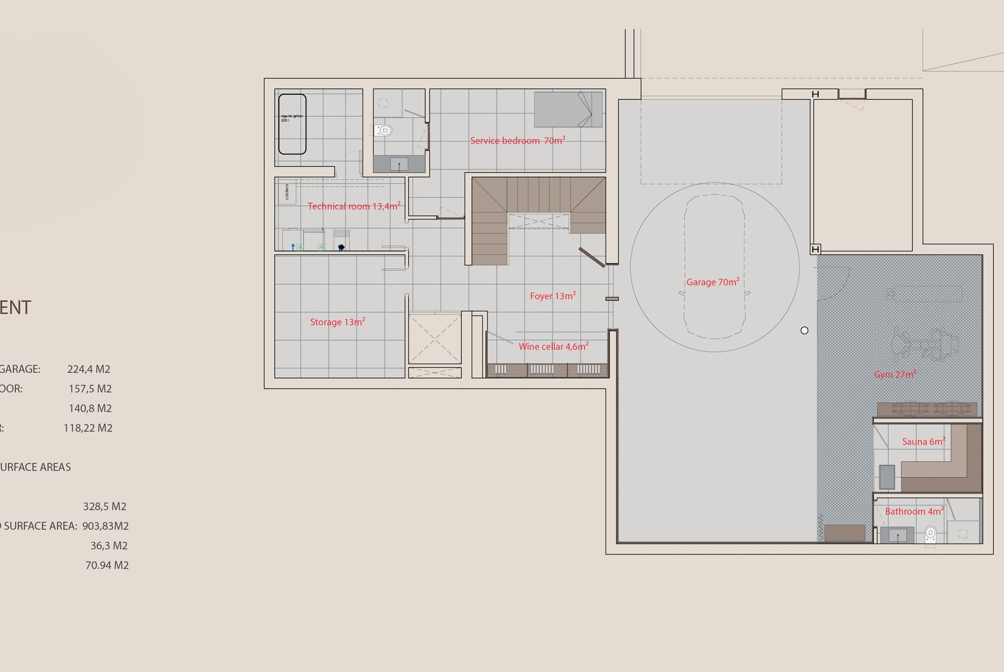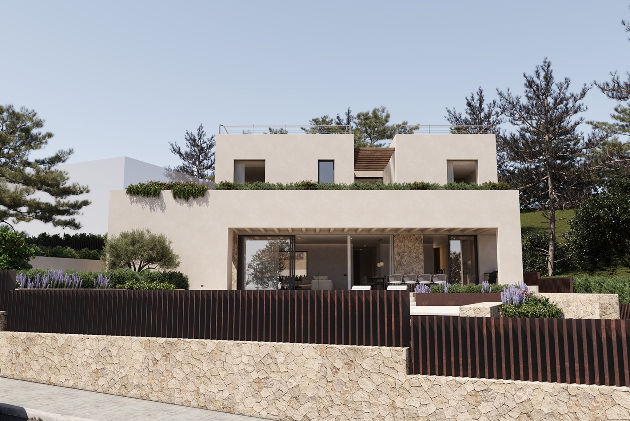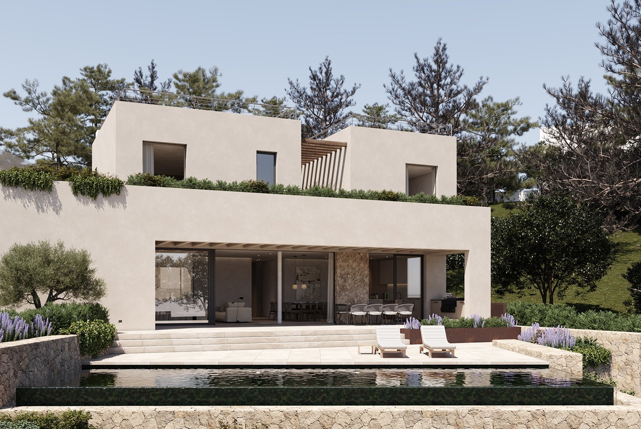 La villa, con una superficie habitable de 537 m², se distribuye en sótano, planta baja, primera planta y una fantástica azotea con solárium privado. Cuenta con 4 amplios dormitorios, cada uno con su propio cuarto de baño, y un aseo de invitados. La cocina abierta se integra a la perfección con el luminoso salón, equipado con electrodomésticos de última generación y diseño de alta gama. Las zonas de estar están diseñadas para maximizar la luz natural y optimizar la funcionalidad.