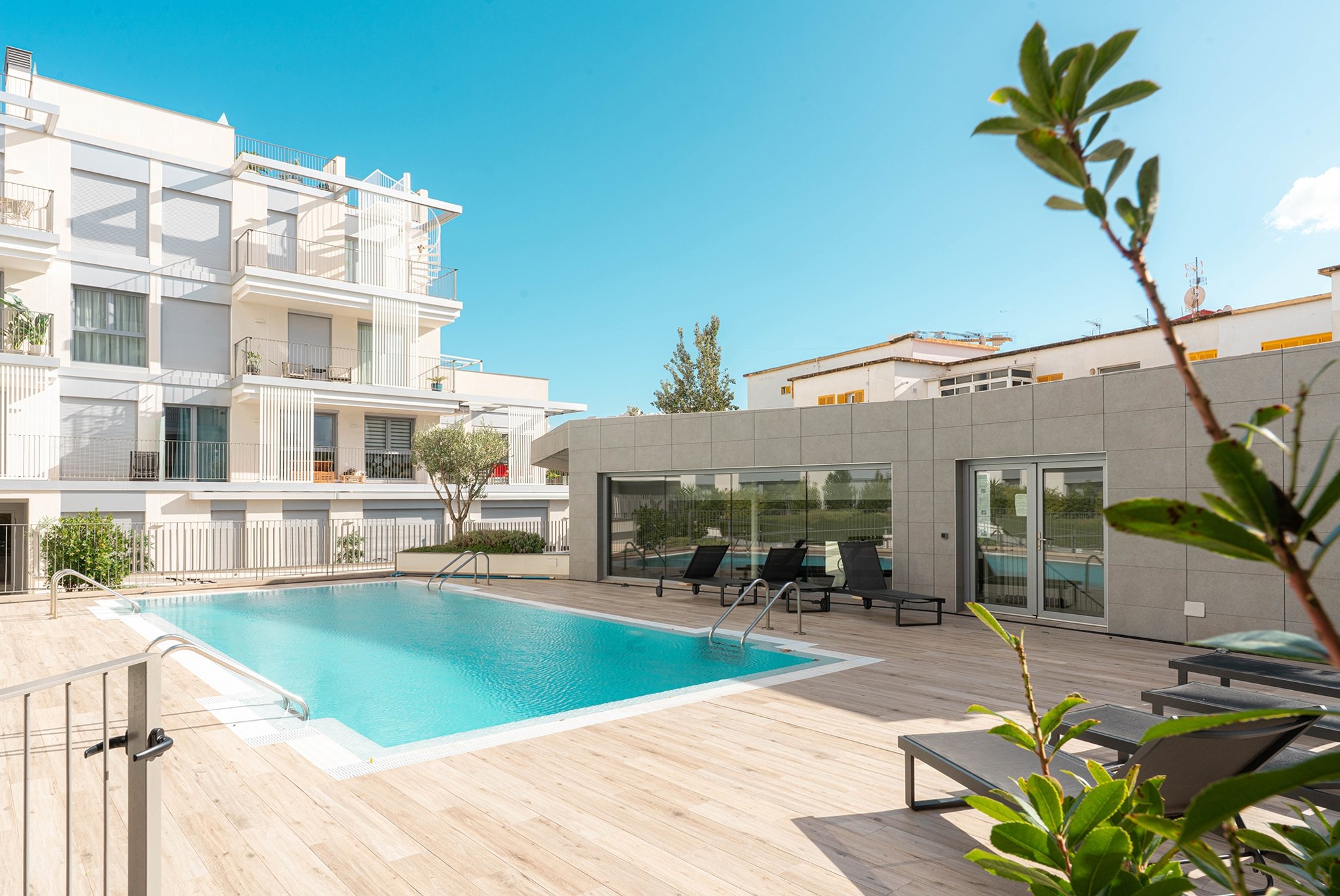 Los residentes también pueden disfrutar de una zona privada con piscina, un gimnasio totalmente equipado y una plaza de aparcamiento en el garaje.