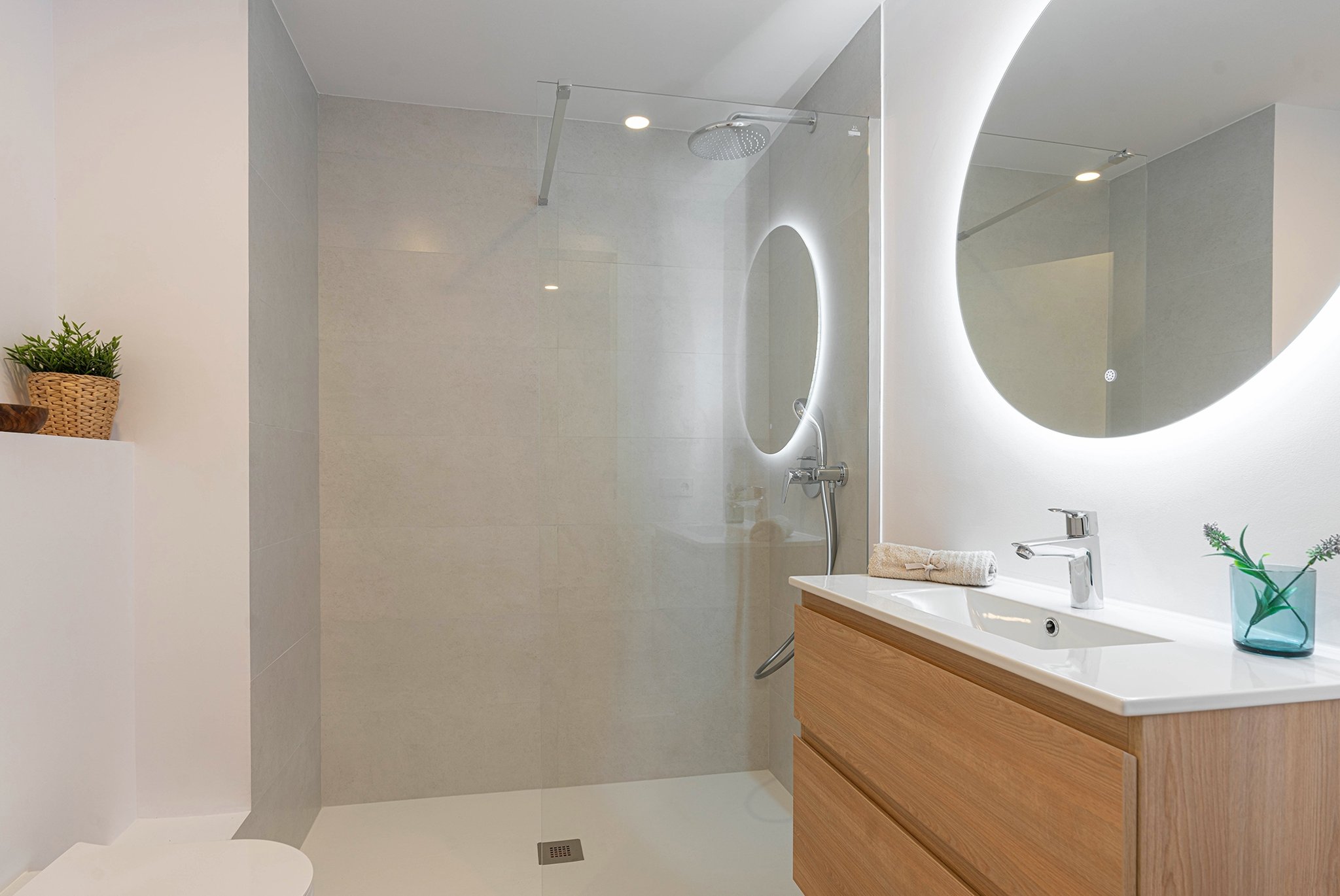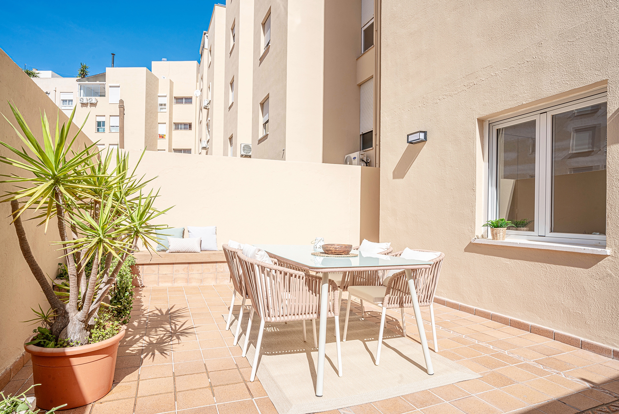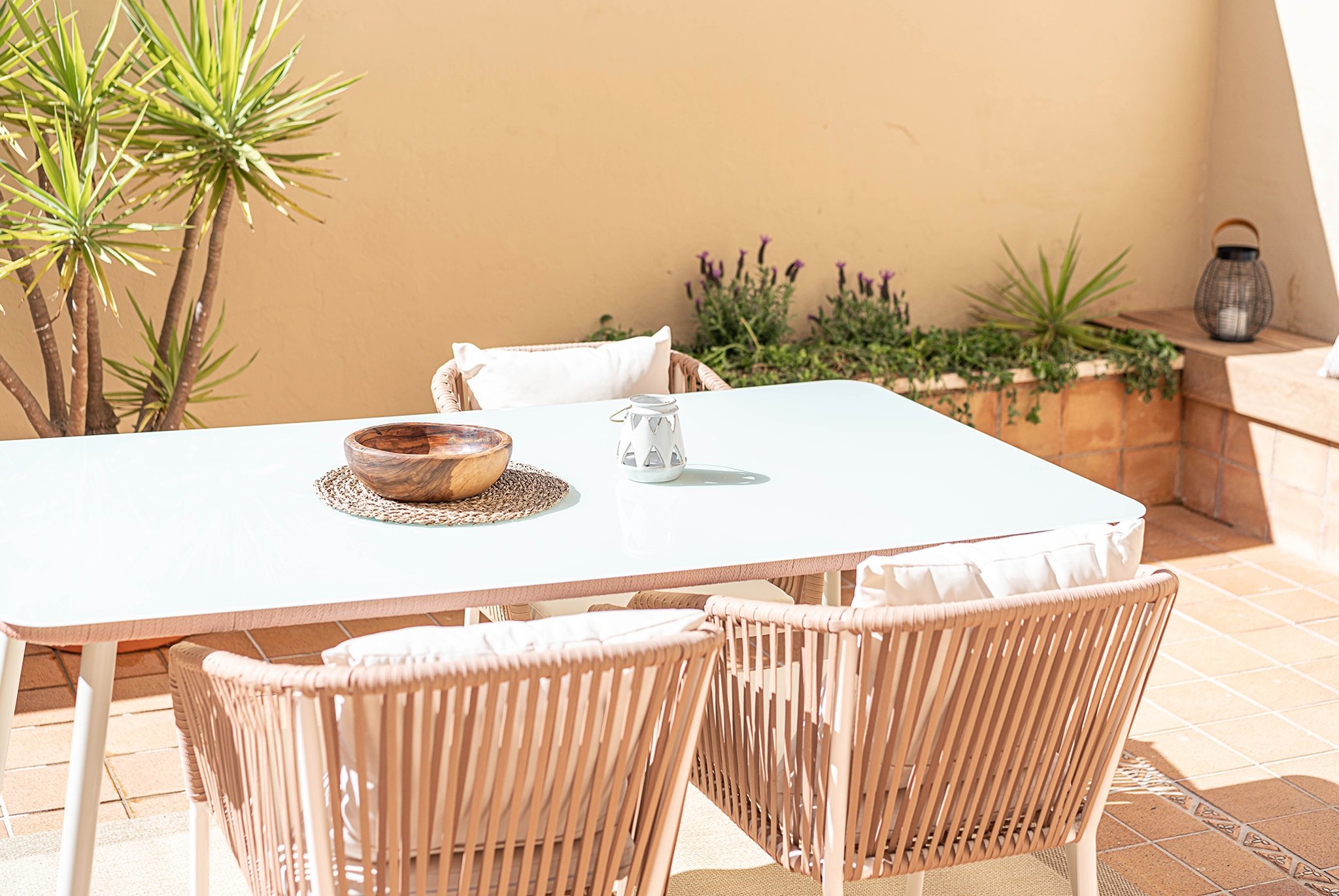 El piso tiene una superficie de 100 m2 más 30 m2 de terrazas. Consta de una cocina americana con una luminosa sala de estar y comedor, tres dormitorios y dos baños, uno de ellos en suite. Desde el salón y el comedor se accede directamente al balcón orientado al sureste. Dos de los tres dormitorios tienen acceso directo a la gran terraza. Todos los dormitorios tienen armario empotrados y aire acondicionado. Todo el piso se vende completamente amueblado. Además, hay un trastero que viene con la propiedad.